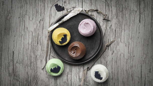 Devilish Red Velvet: Authentic crimson chocolate sponge with smooth cream cheese. Finished with a black bat.