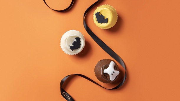 Blood-Curdling Cherry: Belgian dark chocolate sponge. Cherry curd centre. Topped with Amarena cherry cream cheese. Finished with a black bat.
